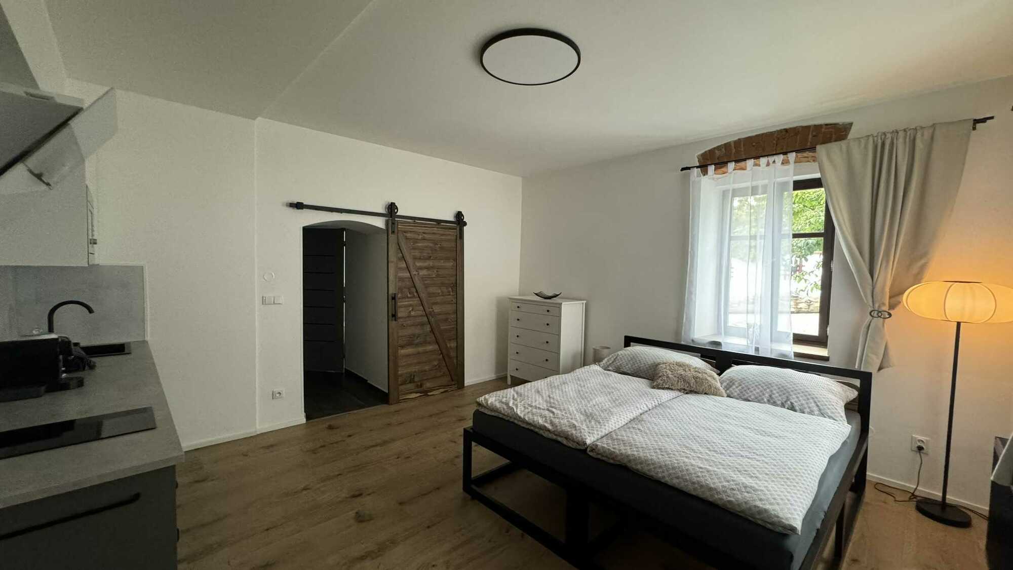 Ložnice s kuchyňským koutem je ozdobeny nádhernými historickými klenbami přímo ve výklencích oken. To dodává prostoru jedinečný a autentický charakter. Ložnice a předsíň jsou odděleny stylovými posuvnými dveřmi, které přidávají na eleganci a praktičnosti.