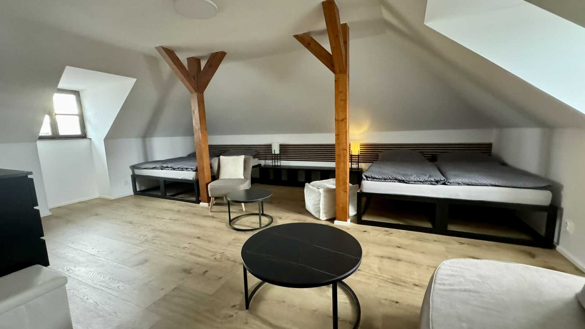 Apartmán Lipno v 3. nadzemním podlaží je ideální pro čtyři osoby a nabízí jedinečný podkrovní prostor, který spojuje historické prvky s moderním komfortem.