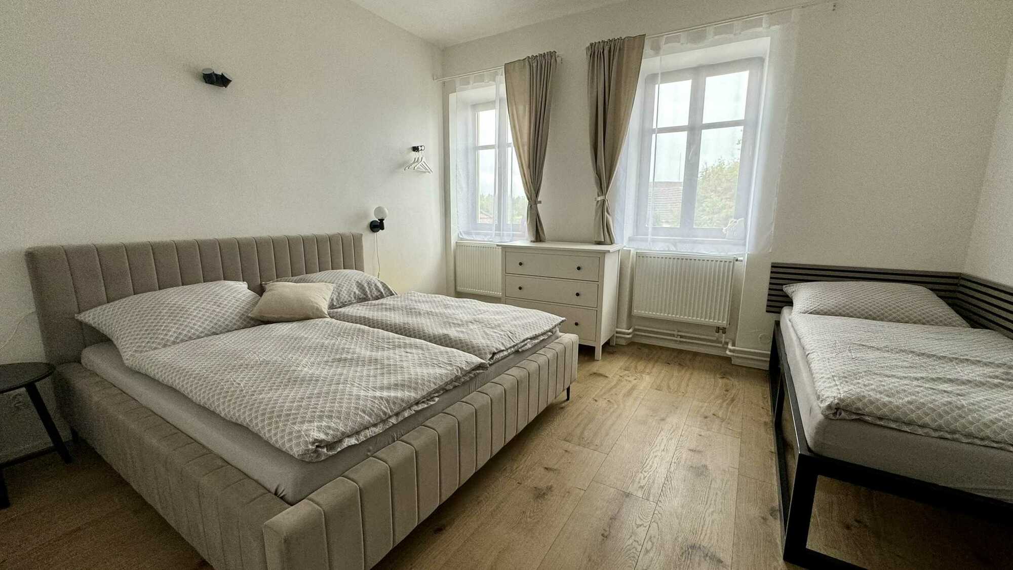 Ložnice je vybavena manželskou postelí a jednolůžkem, přičemž jemná tapeta s přírodními motivy za postelí dodává místnosti klidnou a vyváženou atmosféru. Na přání lze do apartmánu přidat dětskou postýlku.