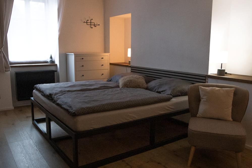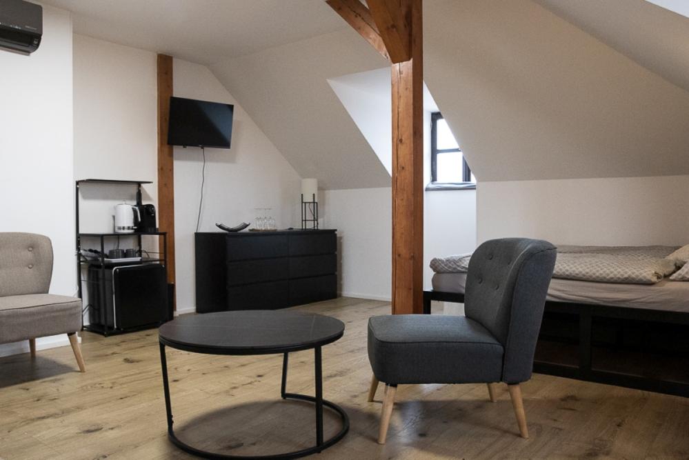 Das Appartement Vltava im 3. Stock ist ideal für zwei Personen und bietet einen einzigartigen Loft-Raum, der historische Elemente mit modernem Komfort verbindet.