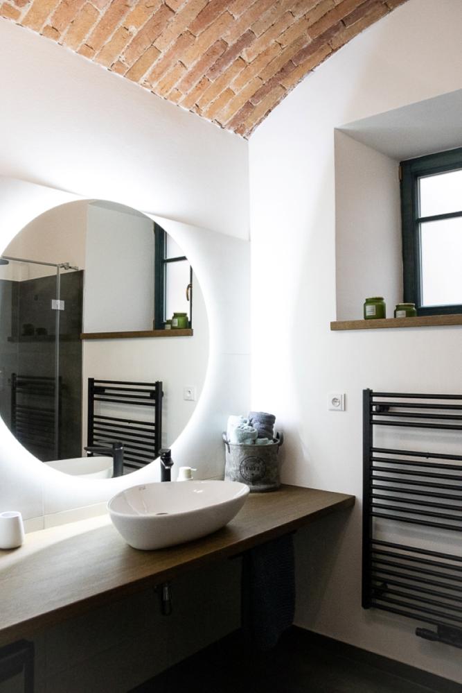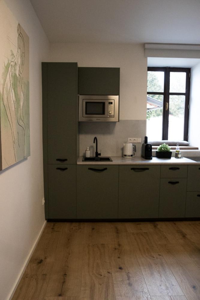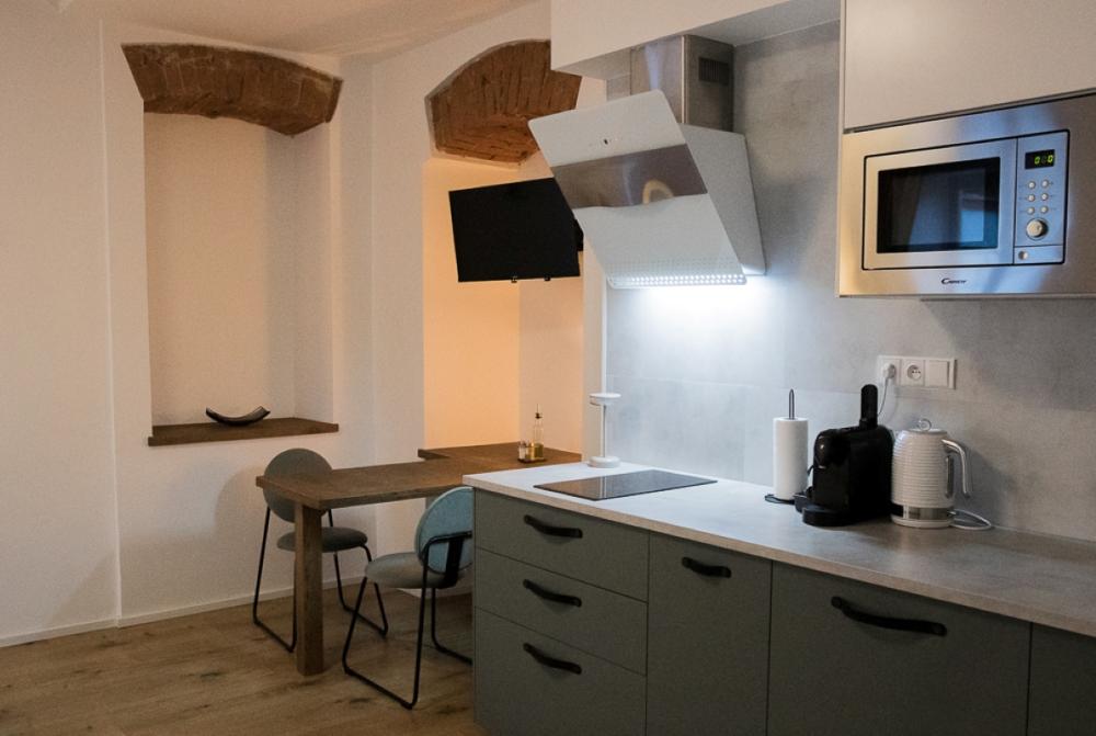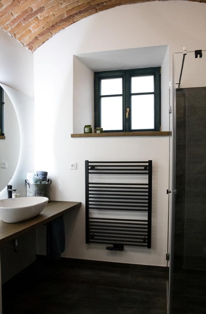 Das Apartment Český Krumlov im 1. Stock ist ideal für vier Personen und bietet eine einzigartige Kombination aus historischem Charme und modernem Komfort. Der Flur, das Badezimmer und die separate Toilette sind mit einem schönen, gegliederten historischen Gewölbe ausgestattet, das dem Raum eine authentische Atmosphäre verleiht. Der Blick aus dem Fenster mit Blick auf die Kirche St. Maria Magdalena unterstreicht