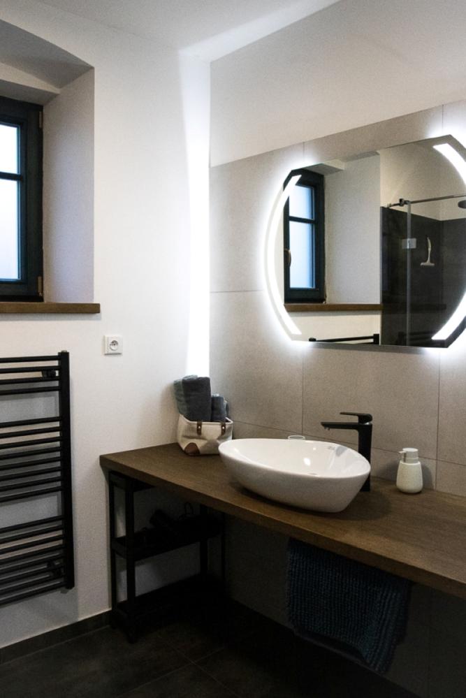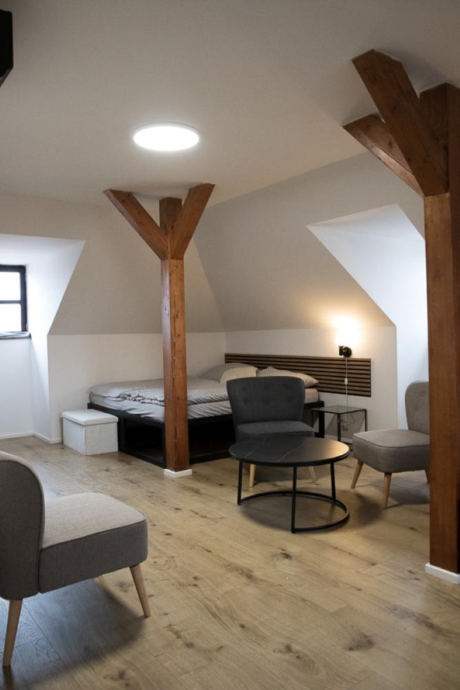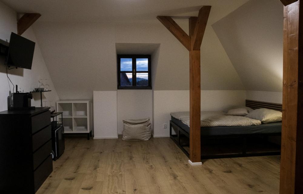Das Apartment Dívčí kámen im 2. Stock ist ideal für zwei Personen und bietet modernen Komfort im ausgebauten Dachgeschoss. Ihr luxuriöses Apartment ist als romantisches Studio-Apartment gestaltet und vereint Komfort, Stil und einen einzigartigen Naturblick mit direktem Zugang zur Terrasse.