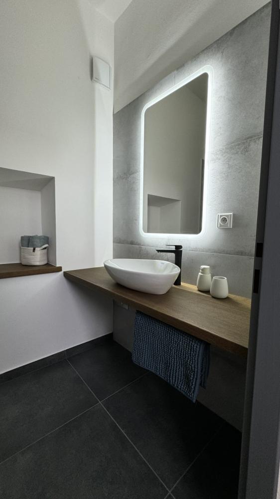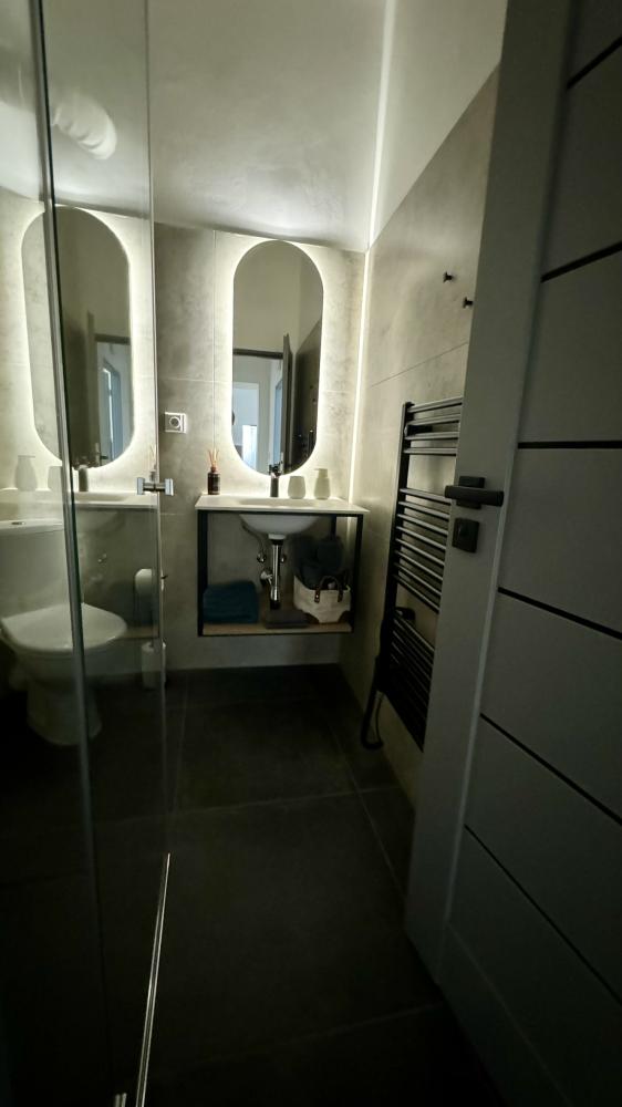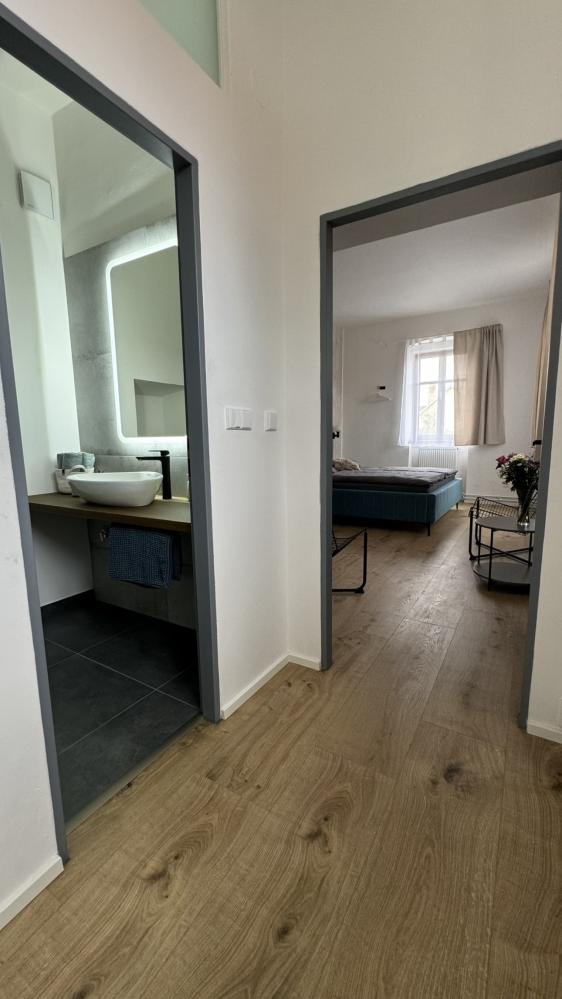 The Český Krumlov Apartment on the 1st floor is ideal for four people, offering a unique combination of historical charm and modern comfort. The hallway, bathroom and separate toilet are decorated with a beautiful, articulated historical vault, which gives the space an authentic atmosphere. The view from the window overlooking the Church of St. Mary Magdalene illustrates the overall charm