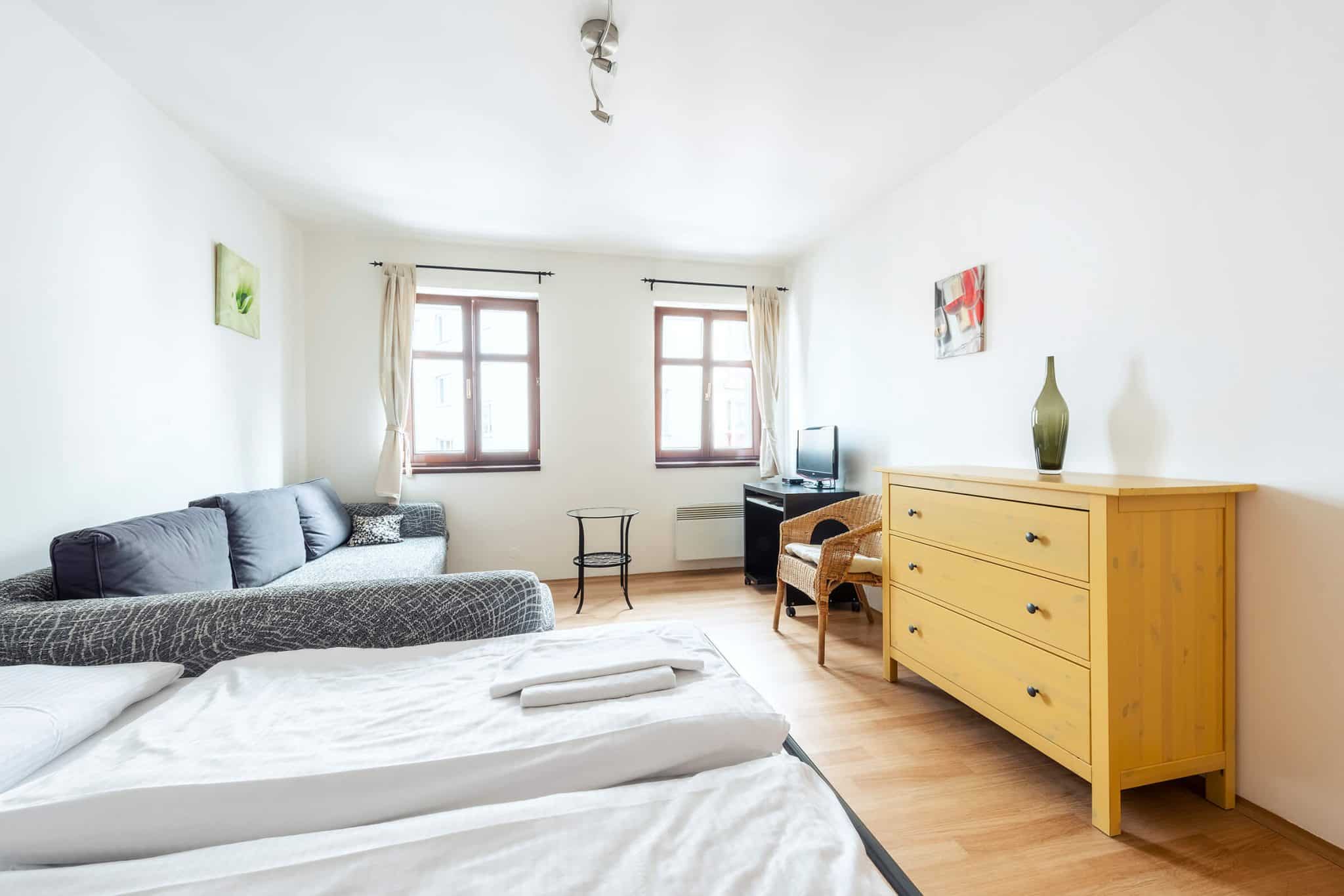Our stylish two-bedroom apartment for four people combines comfort with tasteful design. This apartment is ideal for a family or a group of four friends. 1-2 extra beds can be added to the apartment. One of the bedrooms has direct access to the balcony, where you can enjoy sitting in the fresh air overlooking the quiet courtyard. The second bedroom